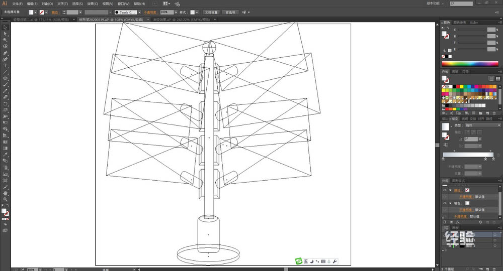 1、使用矩形工具画出路灯架的主杆,再用钢笔画出路灯架上面的结构件的左侧面与右侧面,继续使用矩形画出树形的圆管路径并高上旋转30度,再复制到整个树形路灯架的左右两侧。