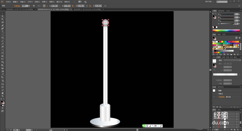 4、我们使用灰白色的渐变填充路灯架中间的圆管,在顶端用深灰色填充圆球,使用网格工具点击圆球让其呈现灰色渐变的立体效果。