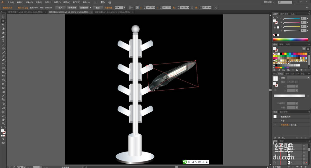 6、其它的圆管结构件与长盒结构件也一一用不同的灰色渐变填充,再把路灯图片去除底色之后进行旋转30度并放到圆管支架上面。