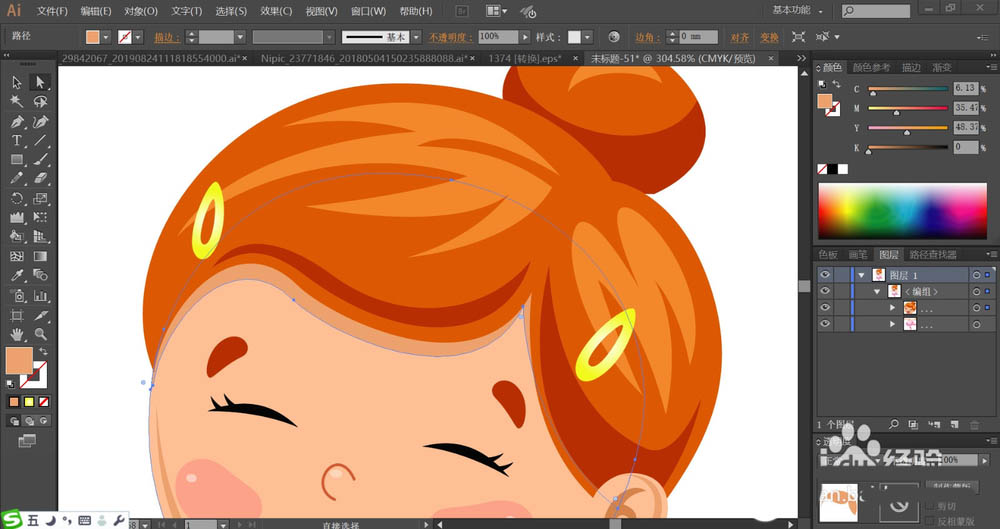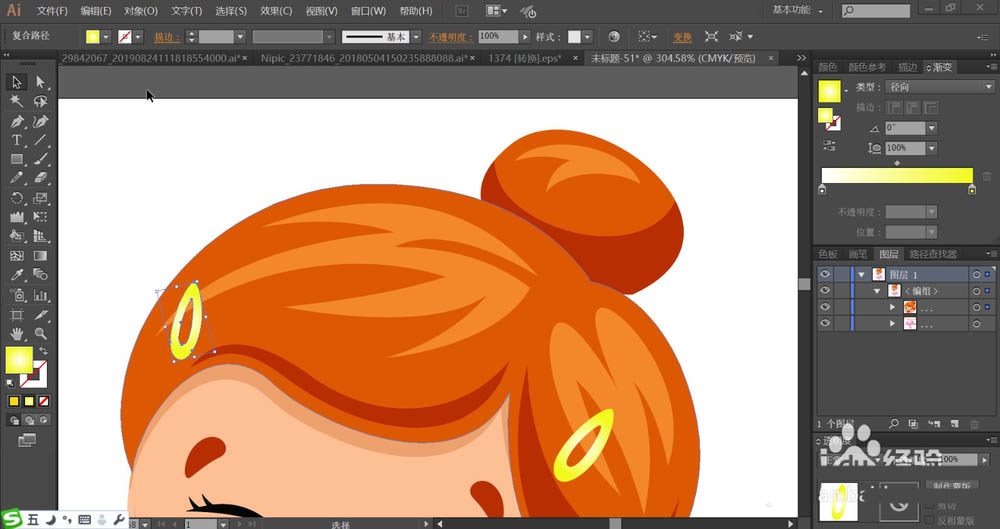 2、设置桔黄色、橙黄色搭配填充头发的主体与高光,再用红褐色填充头发的暗光。发夹用黄色的径向渐变填充。