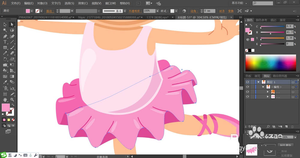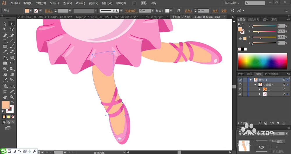7、最后,我们绘制女孩的双腿使用粉色填充,舞蹈鞋用桃红色与粉红色搭配填充,再用白色填充高光路径,完成开心舞者人物画设计。