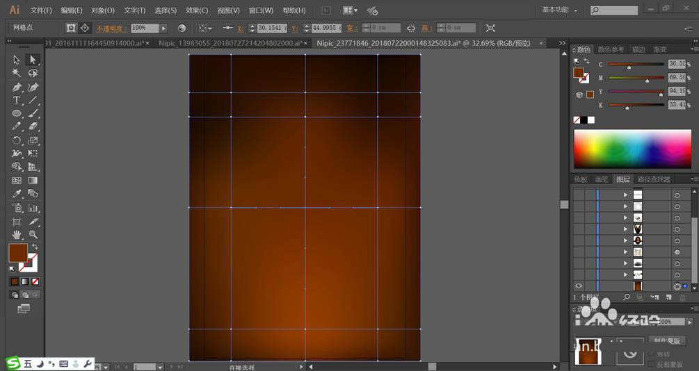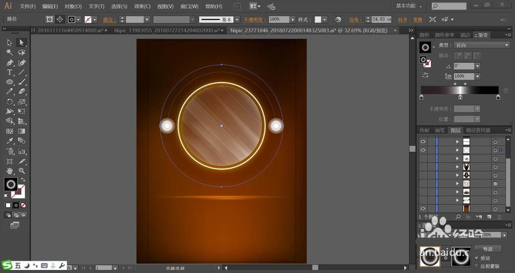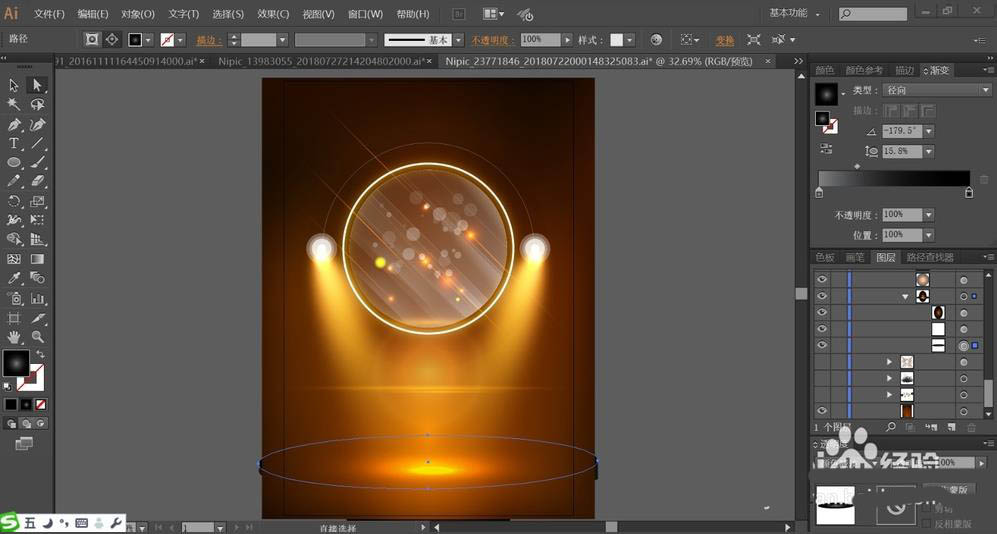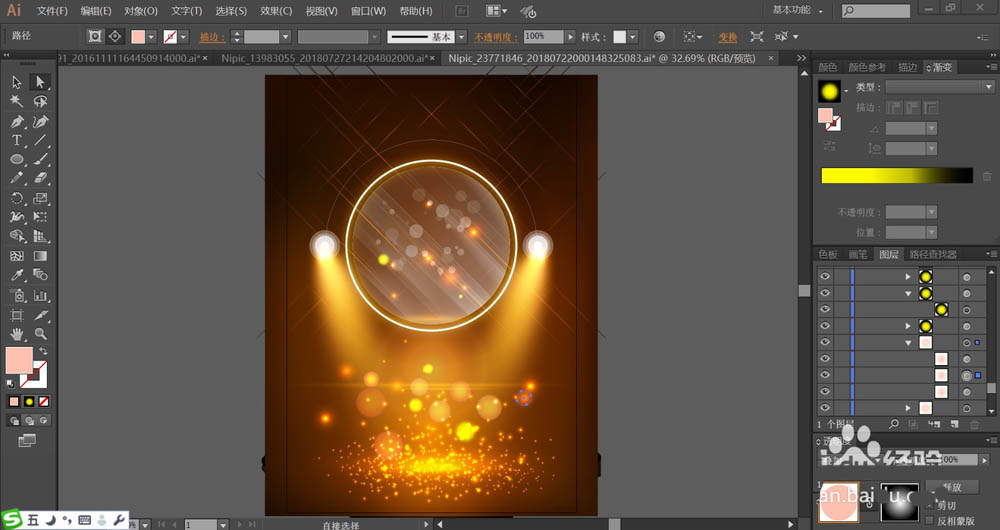 1、使用黄棕色填充背景,再用网格工具做出黄棕色的渐变效果,中间较亮,周围较暗。再用黄棕色的渐变填充背景当中的圆形路径,设置成滤色模式,让高光效果出来。