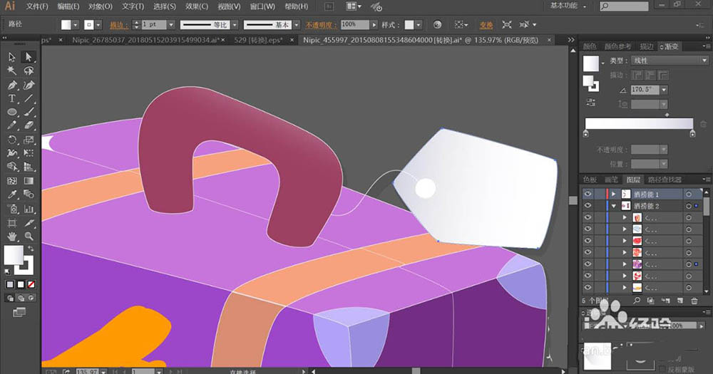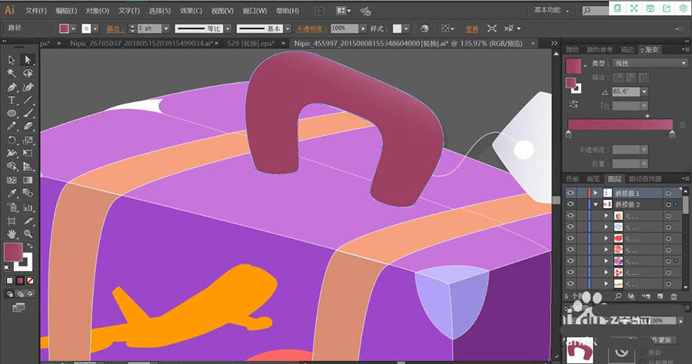 2、使用紫红色的渐变填充旅行箱的手柄,再用灰白色的渐变填充旅行箱手柄上面的卡片。再用灰色填充卡片上面的圆孔。