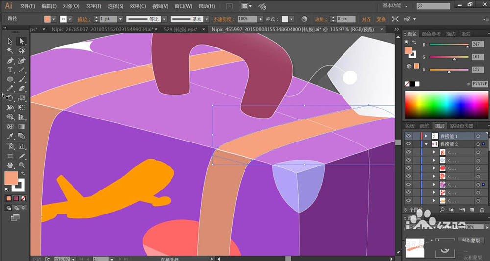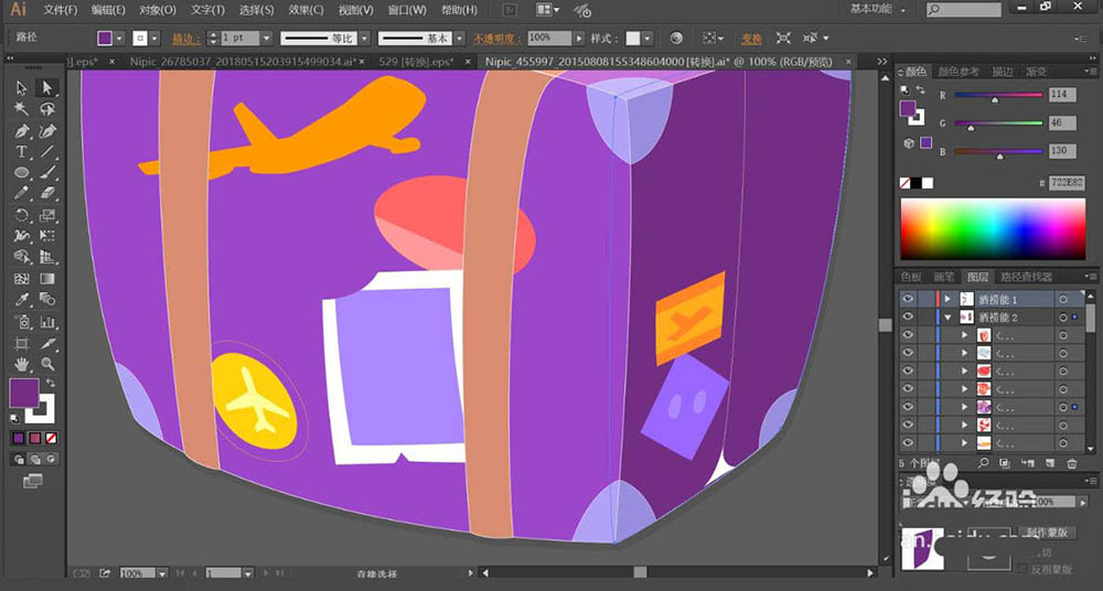 3、接着,我们用淡紫色填充旅行箱的顶端平面,再用灰棕色填充旅行箱上面两侧的包装带。旅行箱上面的飞机用橙黄色填充。