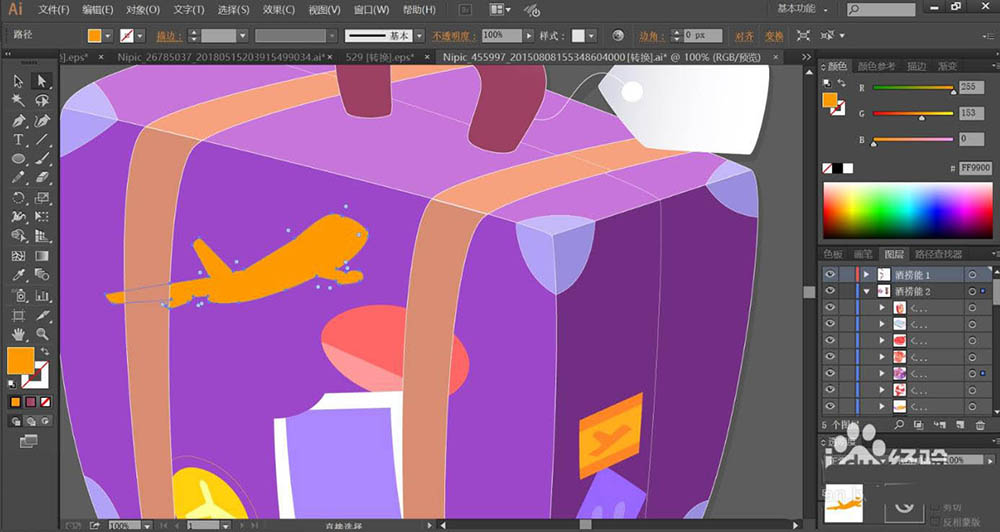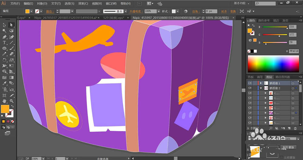 6、使用橙黄色与黄灰色搭配填充旅行箱正面的飞机图案,旅行箱侧面的卡片用桔红色与桔黄色搭配填充图案。