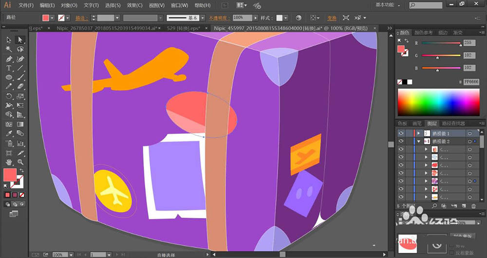 1、使用钢笔画出旅行箱的基本轮廓路径,再画出旅行箱上面的贴纸图案,重点绘制旅行箱的细节元素,包括箱子的各个顶端与边缘,还有箱子的阴影一一绘制出来。