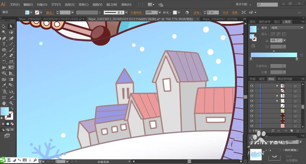 6、使用蓝灰色与灰色搭配填充围巾上面的高房子与小城堡,使用红灰色与灰色填充围巾上面的小房子。天空的雪花用白色与深蓝色填充。围巾的右侧边缘用蓝灰色与红棕色分别填充与描边。