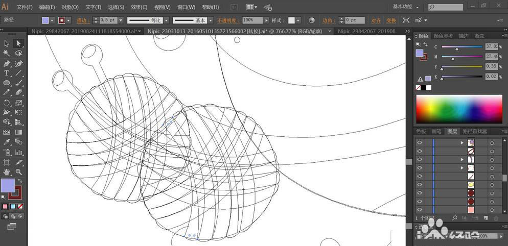 7、最后,我们用钢笔画出组成毛线球的圆弧再通过复制旋转成为毛线球的形状,两个毛线球分别填充多种不同的粉红色与蓝灰色,完成织围巾场景画设计。