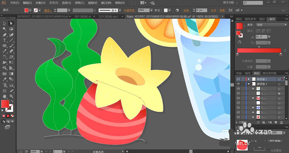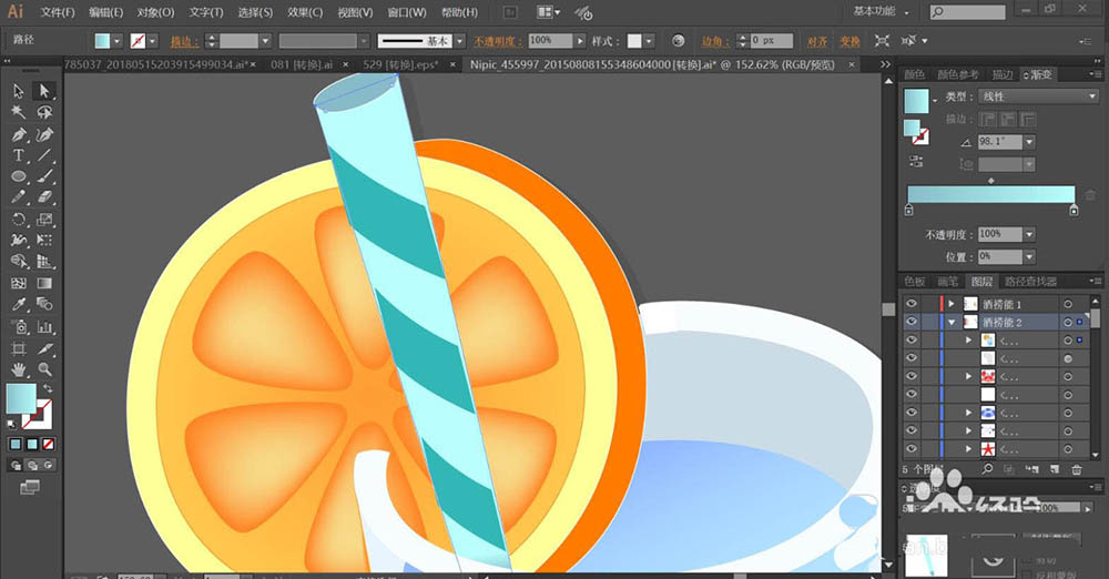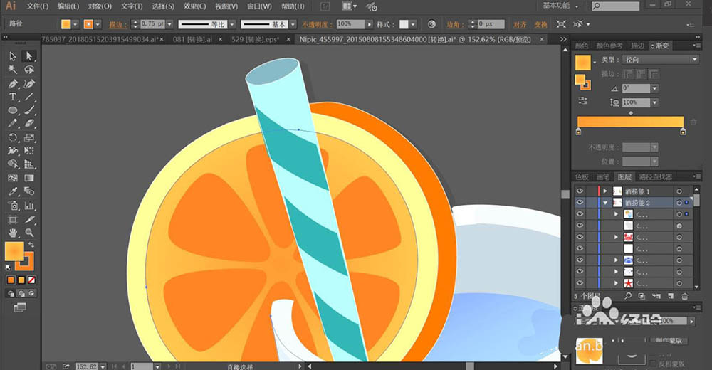 3、使用网格工具点击一下果肉的暗光路径让其呈现桔红色的渐变效果。吸管的路径用淡青色的渐变填充。