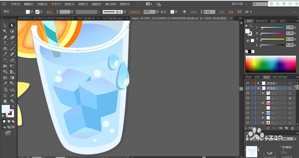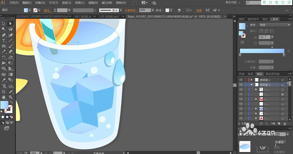 5、玻璃杯的内壁用蓝灰色填充,外壁用天蓝色填充。杯内的液体用天蓝色的渐变填充,杯内的冰块用天蓝色的渐变与蓝色搭配填充,冰块的两个侧面填充不同明度的蓝色。杯外的水滴用较亮的天蓝色的渐变填充,再用白色填充亮光所在的路径。