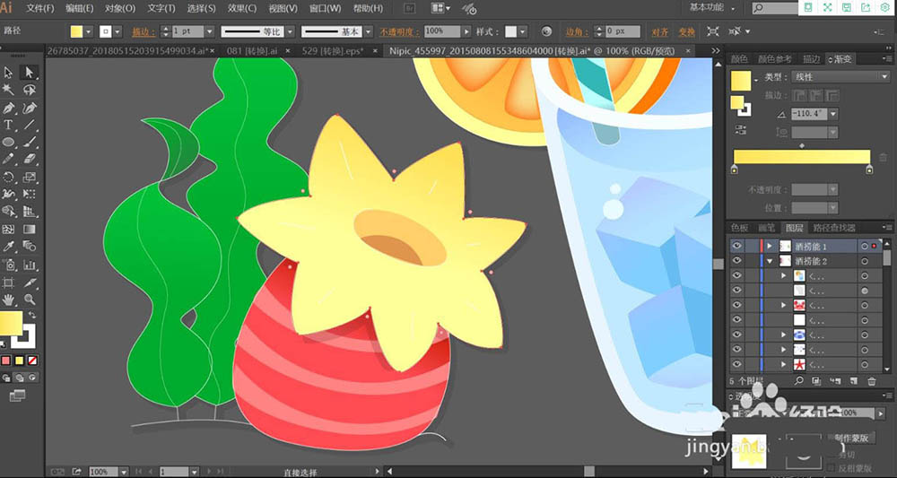 6、接着,我们用黄色的渐变填充左侧的水果的花朵,内部的花蕊用暗橙色填充。下方的水果用红色的渐变与红灰色搭配填充水果的主体与高光路径。