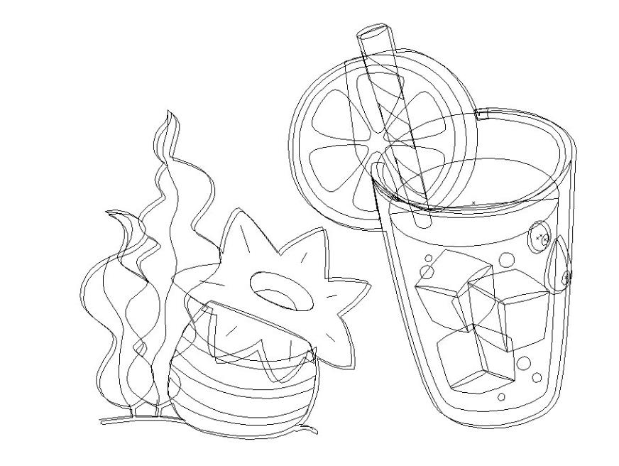 1、使用钢笔画出绿叶与水果的细节,再画出柠檬片的内外结构,接着,我们画出吸管与玻璃杯还有杯内的液体细节路径。