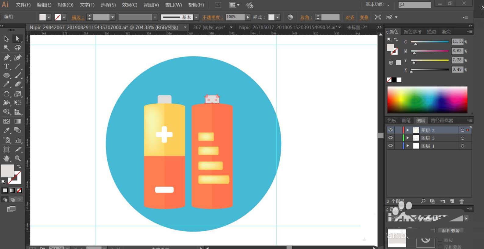 2、用蓝色填充背景圆形,再用桔红色填充电池的主体,用灰白色填充电池的顶端。