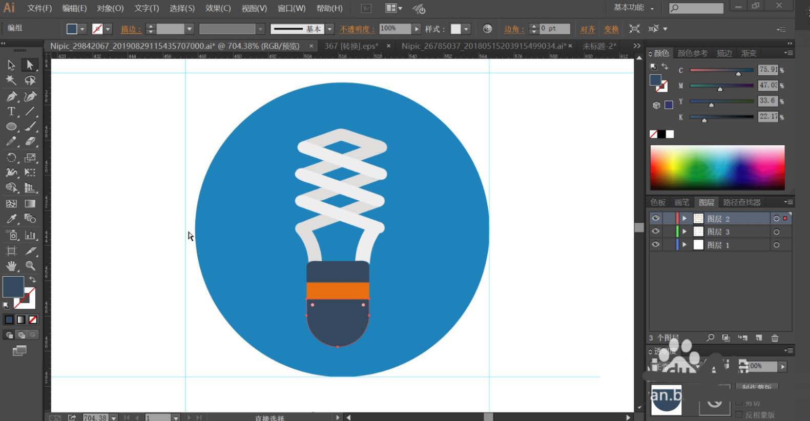 5、使用钢笔绘制出节能灯的灯座与灯芯的结构路径,用不同的路径呈现不同的光线变化。