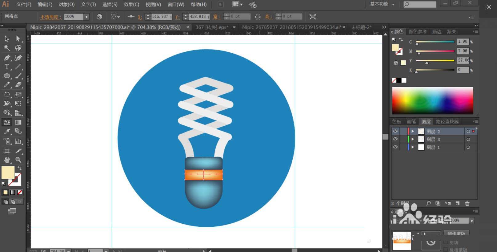 7、用不同的灰白色填充灯芯的明暗区域,再用网格工具点击灯座让其呈现渐变色,完成节能灯图标设计。