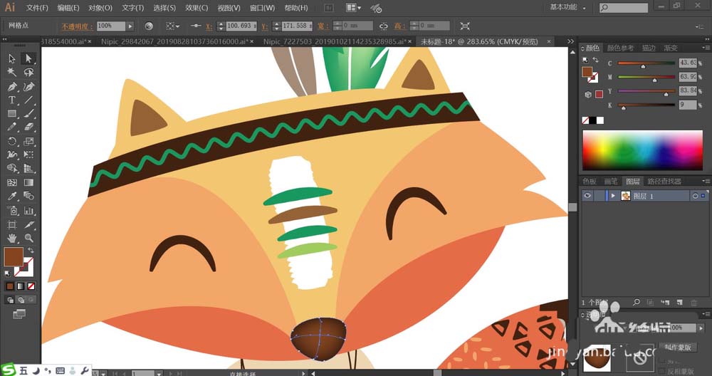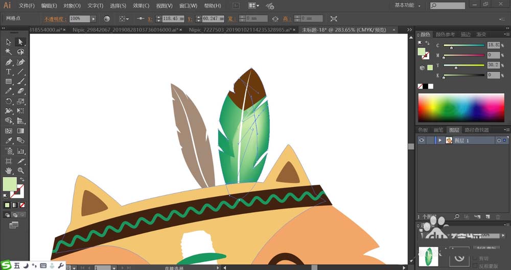 2、使用灰色与绿色分别填充狐狸头上的两根羽毛,再用暗棕色填充右侧羽毛的顶端,使用网格工具点击一下右侧羽毛让其呈现绿白色的渐变。羽毛的中间用白色填充。