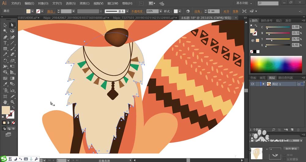 6、这一步,我们用绿色与棕色搭配填充狐狸的项链路径,再用网格工具点击一下项链下方中间的小吊坠让其呈现暗棕色的渐变效果。