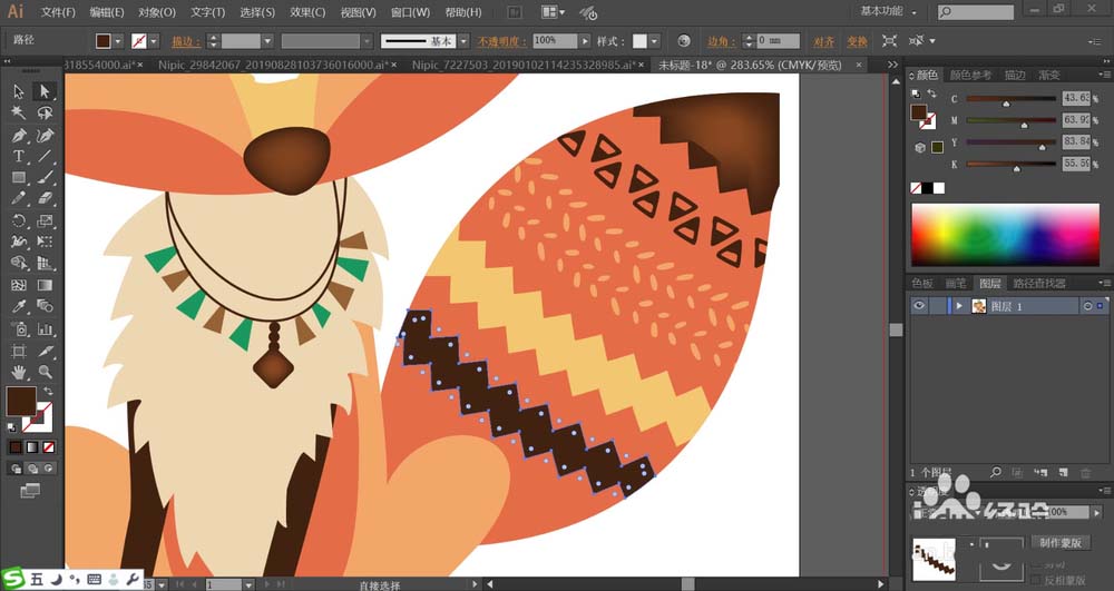 7、最后,我们用桔红色填充狐狸的大尾巴,再用暗棕色、黄色搭配填充尾巴上面的图案,使用网格工具点击尾巴的顶端让其呈现暗棕色的渐变效果,完成狐狸图案设计。