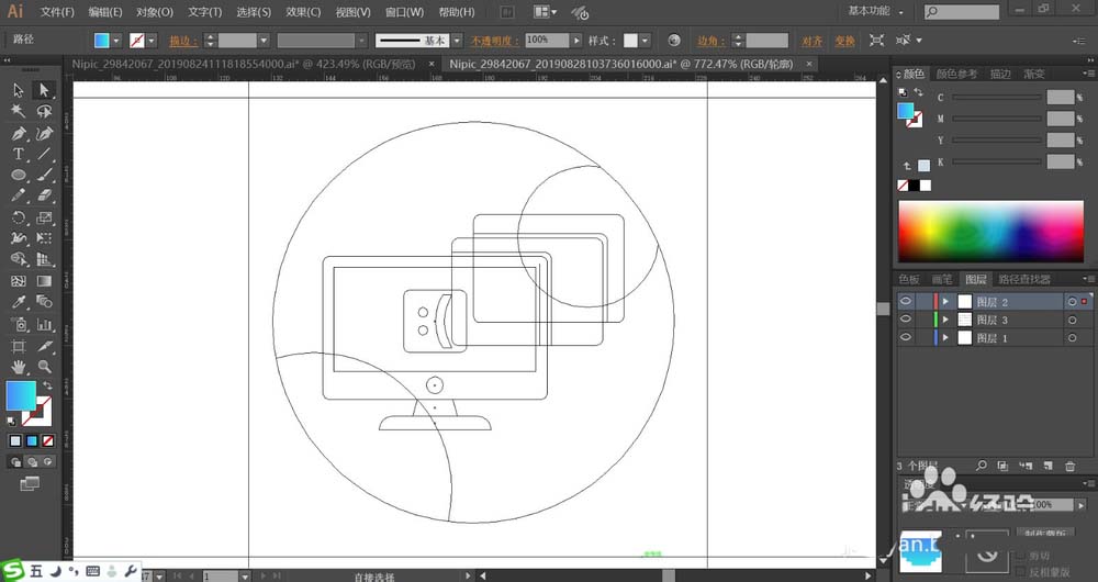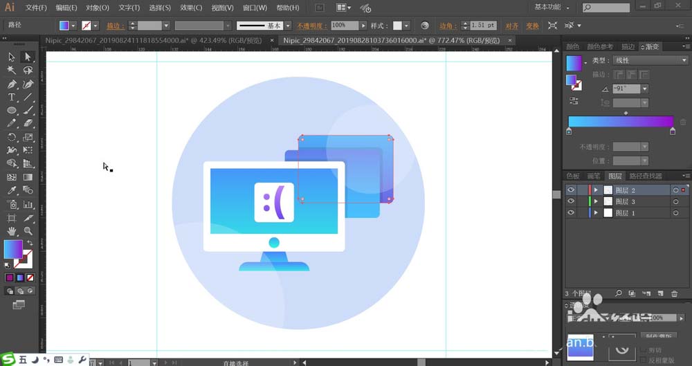 1、使用矩形工具画出不同的屏幕路径在圆形的背景上面,再使用钢笔工具画出屏幕上面的笑脸形状,再用圆形画出图标两侧的高光路径。