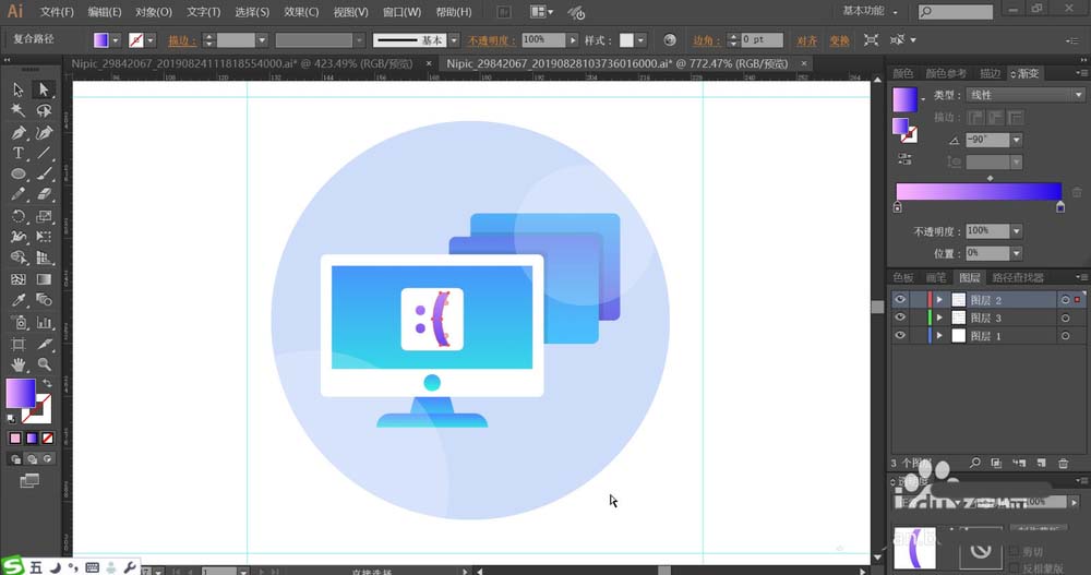 3、设置粉红色到蓝色的渐变填充屏幕上面的笑脸路径,再用蓝紫色的渐变填充屏幕后面的圆角矩形,最后的一个圆角矩形用反向的蓝紫色的渐变填充。