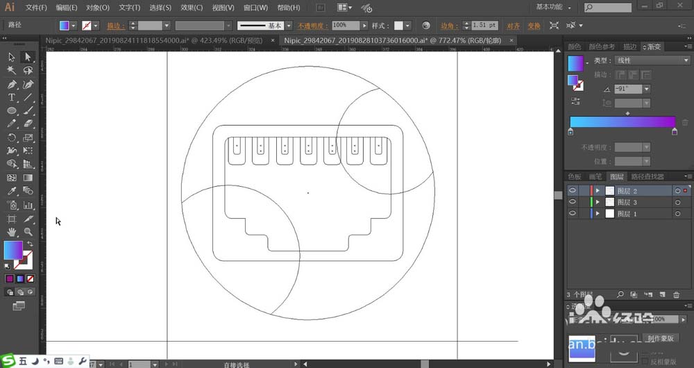 5、接着,我们再来画一画局域网图标,这个图标的创意就是绘制出一个光纤结头的截面路径,使用矩形、圆形、钢笔工具画出截面当中的细节路径。