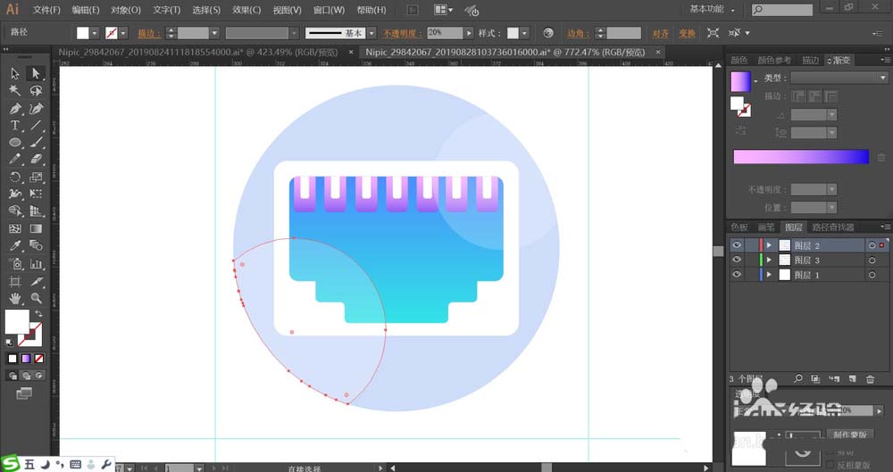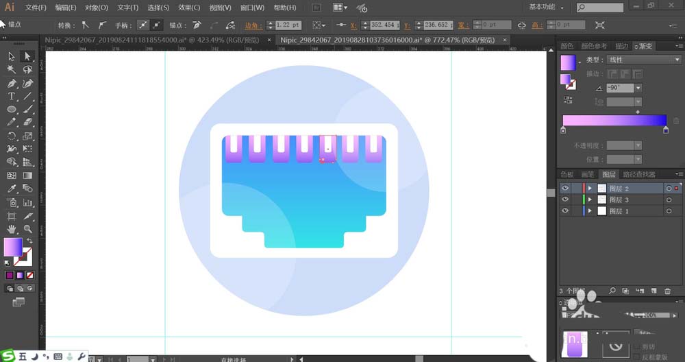 7、用蓝紫色的渐变填充结头上方的圆角矩形,再用白色填充矩形中间的孔洞,使用半透明的白色填充图标高光路径,完成局域网图标设计。