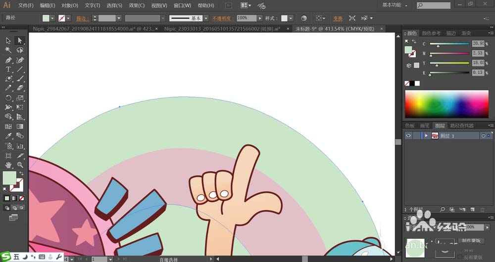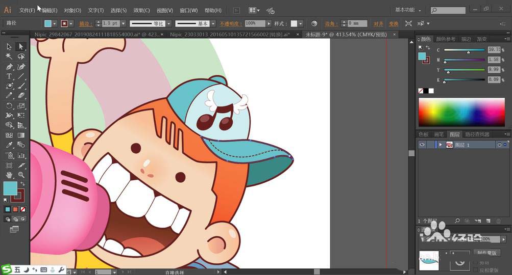 2、使用青色与粉红粉色搭配填充圆形的背景路径,男生的手臂用黄粉色填充。