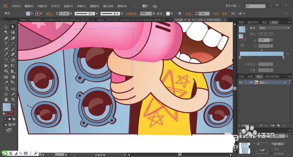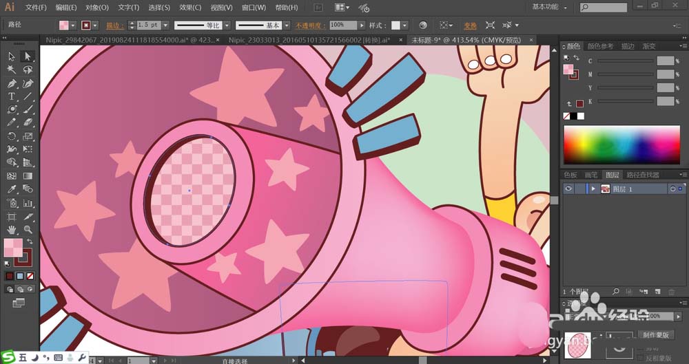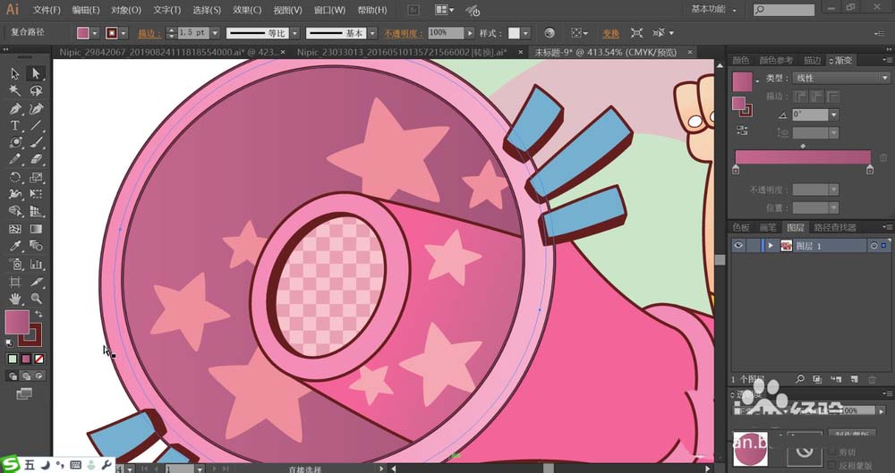 3、接着,我们用暗粉红色的渐变填充喇叭的正面路径,再用桃红色填充正面的星星路径与喇叭的边缘路径。