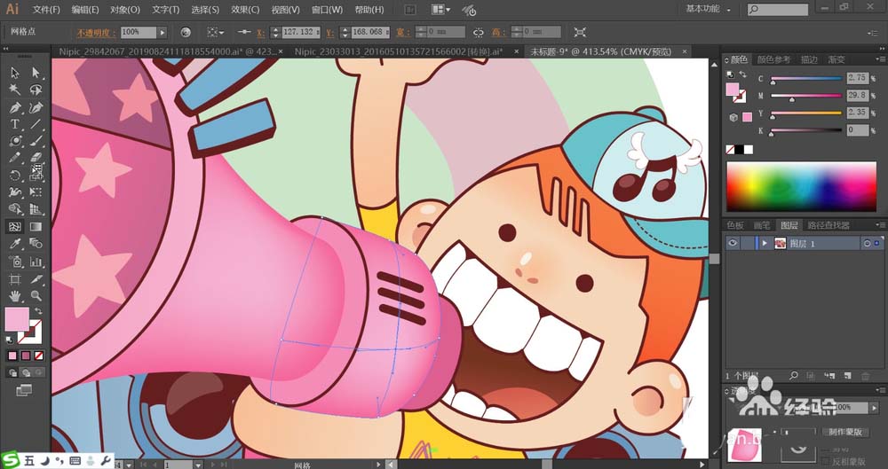 4、喇叭后端的主体与手柄用桃红色填充并通过网格工具做出渐变色的效果,喇叭的正面扩音放射形状路径用蓝色与红棕色搭配填充,蓝色在上方,红棕色在下方。