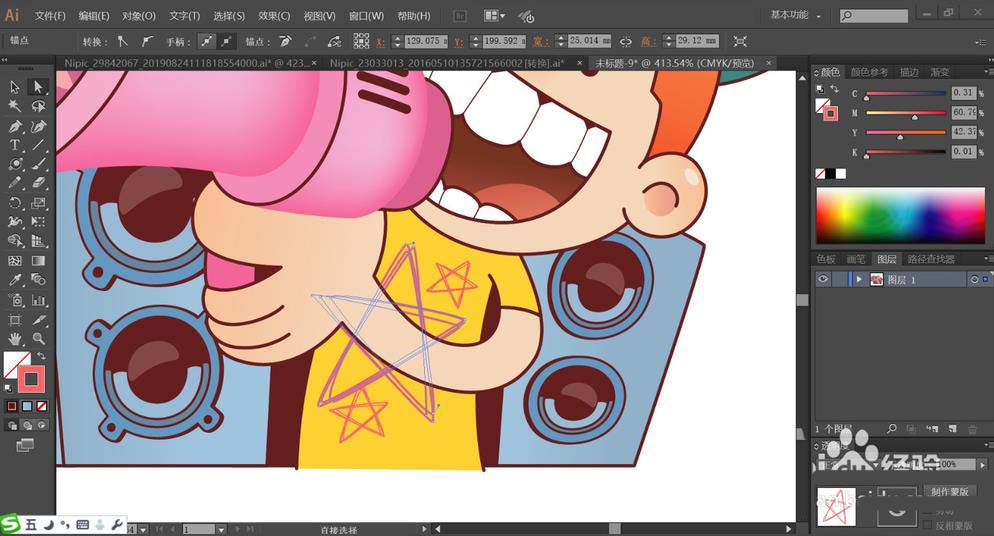 7、男生的衣服用橙黄色填充,衣服上面的图案用桃红色进行勾勒。男生身后的音箱用蓝色的渐变与红棕色搭配填充,在边缘附近适当调整相似色呈现色调的明暗效果,完成宣传人物画设计。