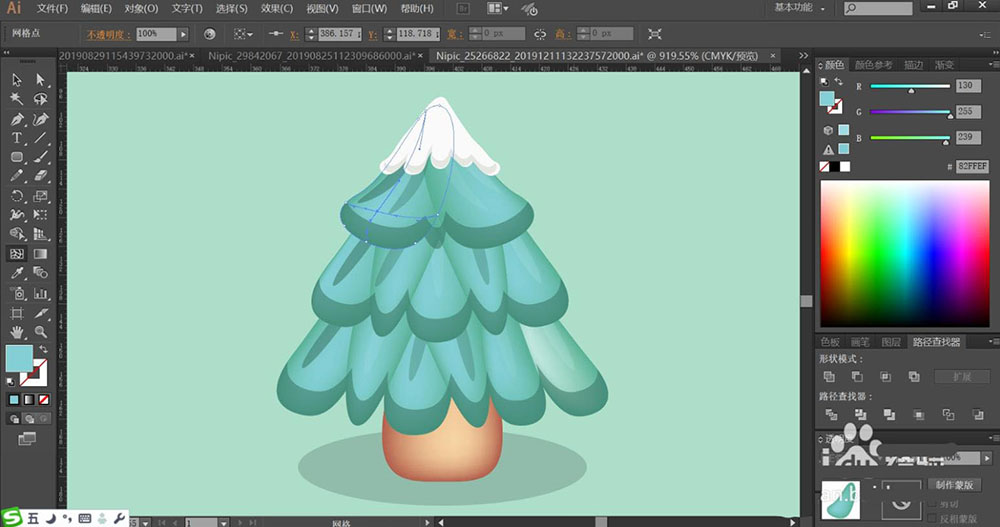 4、使用网格工具点击一下小圣诞树的叶片与树干让其呈现渐变色,树叶上面的亮光用滤色模式的绿色填充并设置成半透明的效果。暗光用半透明的绿色填充,阴影用黑色填充并同样设置成半透明的效果,完成小圣诞树图片设计。