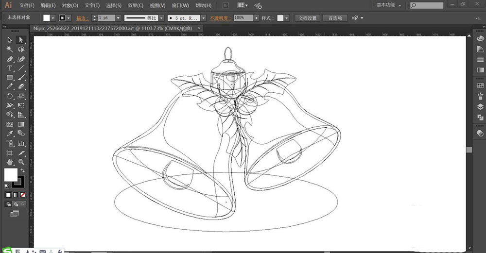 1、使用圆形画出铃铛的圆形开口,再用钢笔描绘出铃铛的基本轮廓,重点绘制铃铛顶端的绿叶与结构细节的路径,再用钢笔画出铃铛表面的暗光与亮光路径。