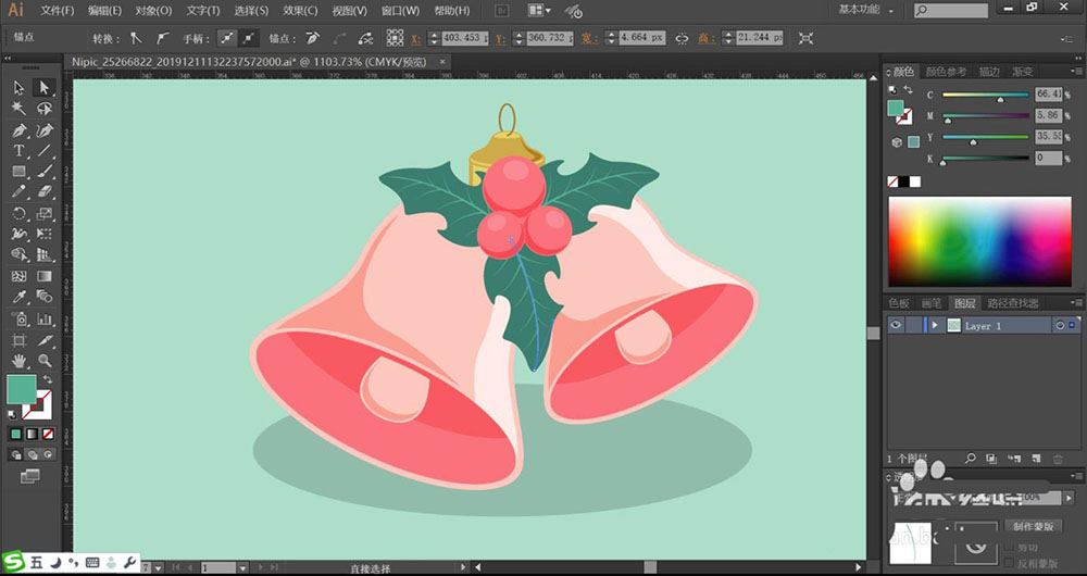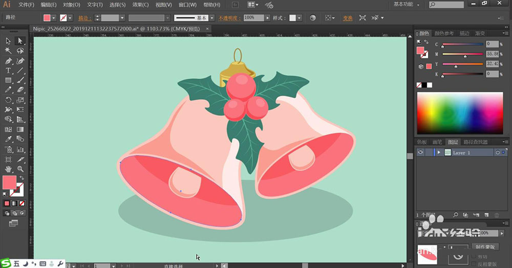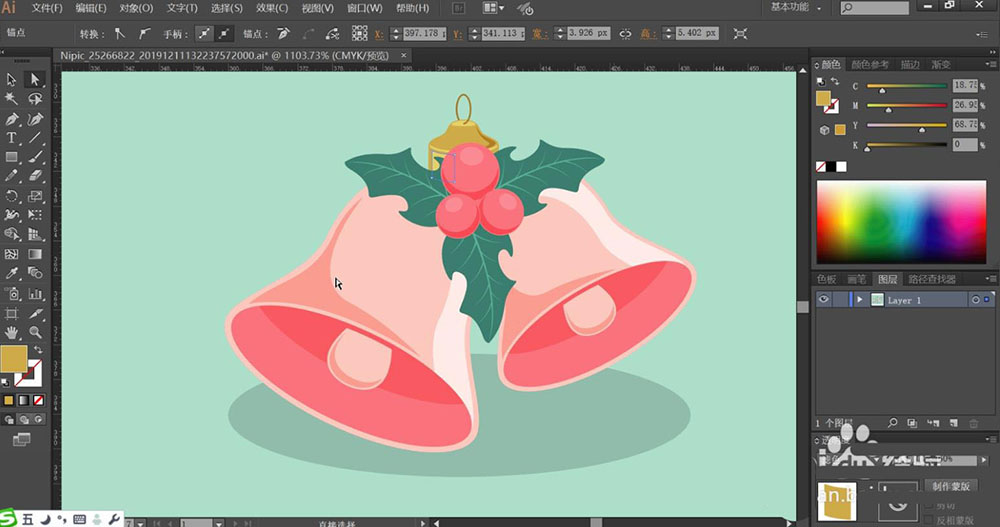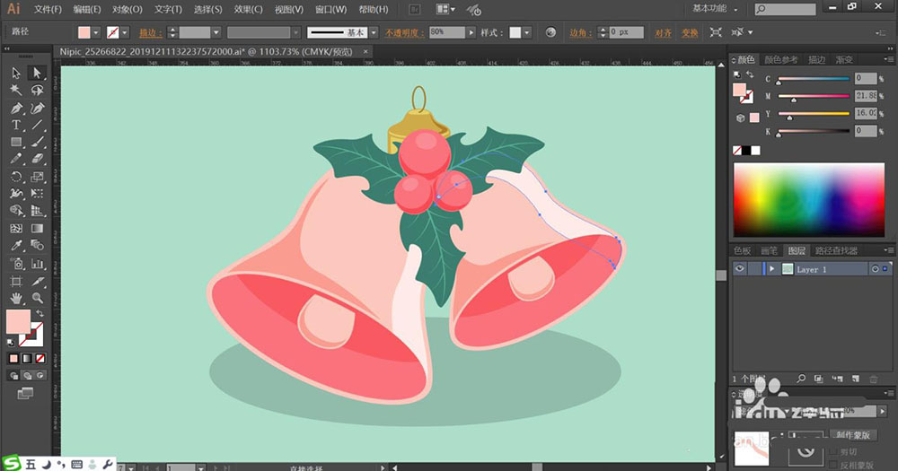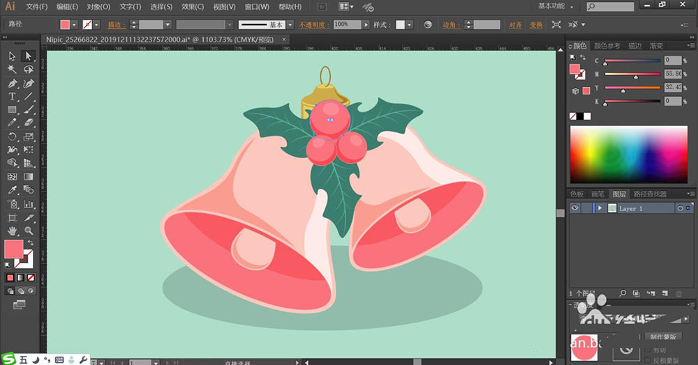 4、铃铛内部的撞球用淡粉红色填充,暗光用正片叠底的粉红色填充。铃铛上方的绿叶中间的红色果实的填色方法与铃铛一样,也是分别用滤色模式的粉红色填充亮光,用正片叠底的粉红色填充暗光。