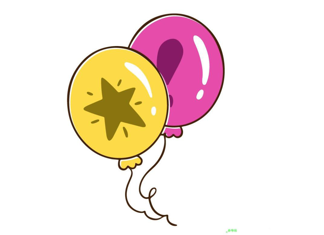 2、使用品红色与黄色分别填充两只气球,再用白色填充气球的右侧高光圆弧。