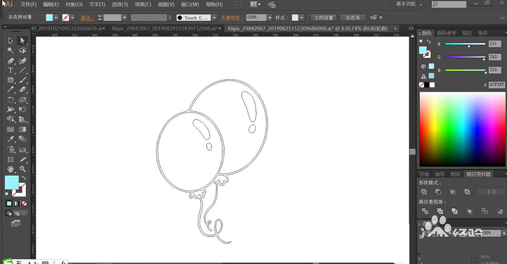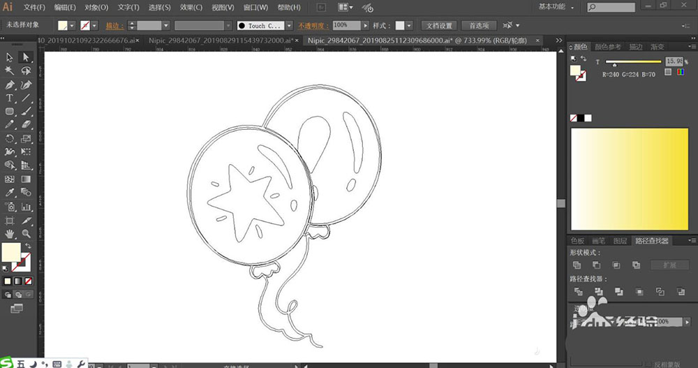 1、使用圆形工具画出两只气球的形状路径,再用钢笔车出气球上面的高光路径,与气球下方的挂绳路径。