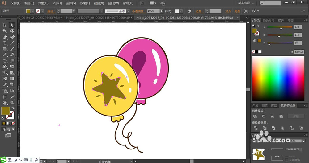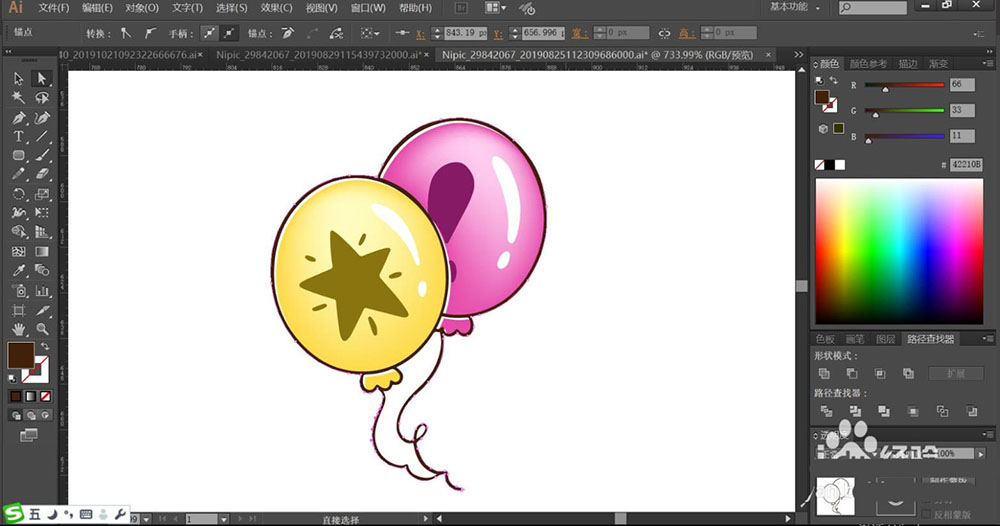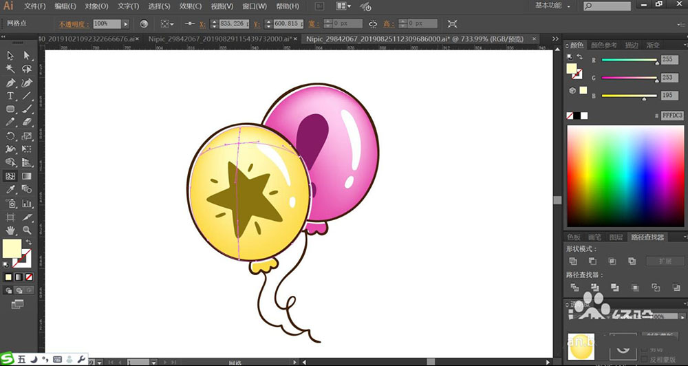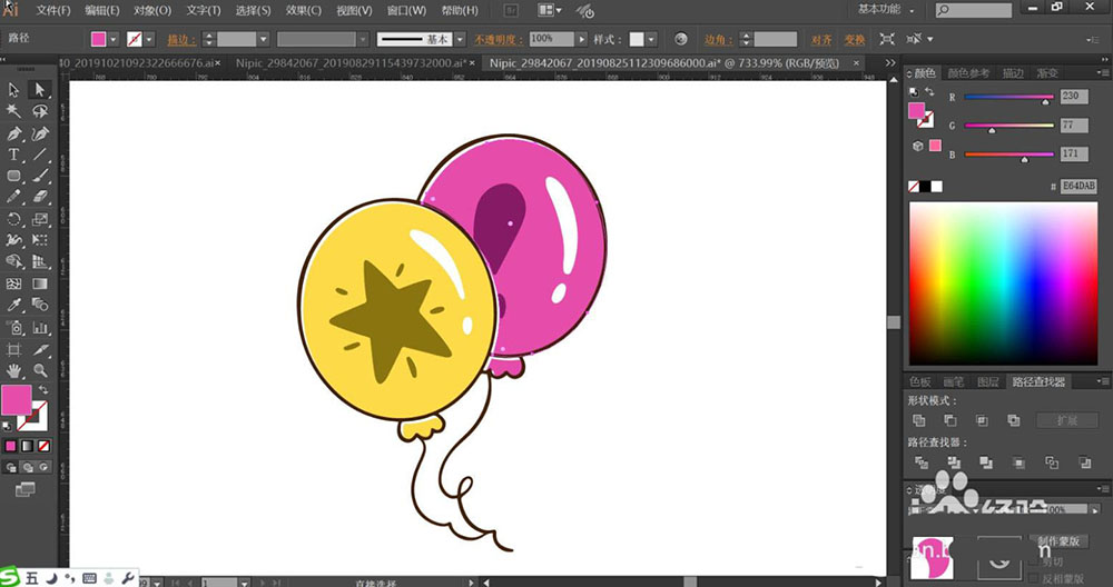 3、气球上面的图案分别用暗品红色与黄绿色填充,气球下方的结头用品红色与黄色分别对应填充。