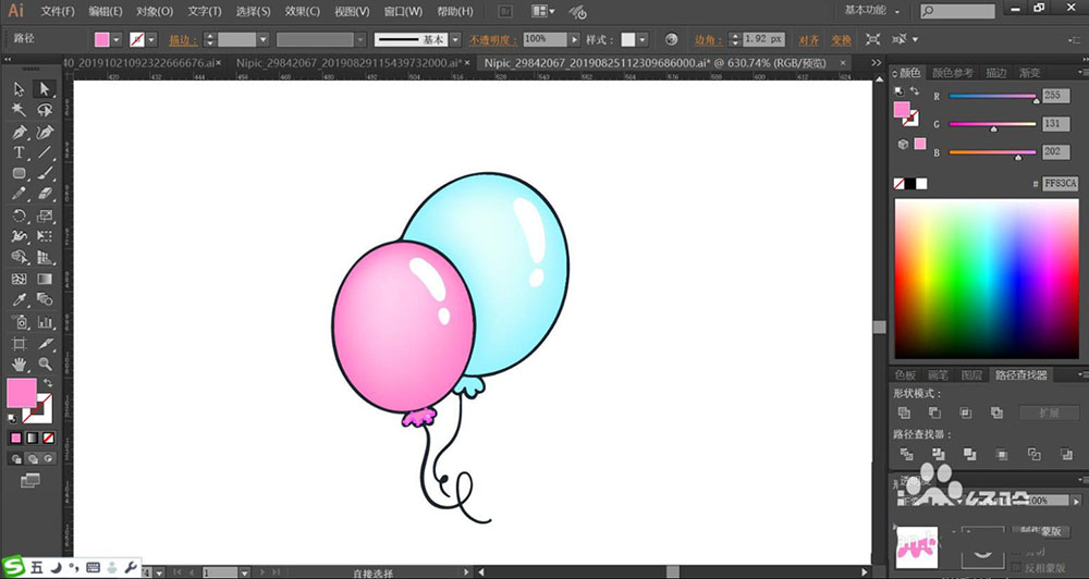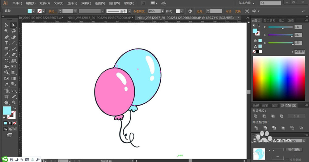 6、使用浅蓝色与品红色搭配填充两只气球的主体,再用白色填充高光路径,使用网格工具点击气球让其呈现渐变色,气球的绳索用黑色填充。