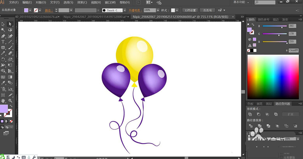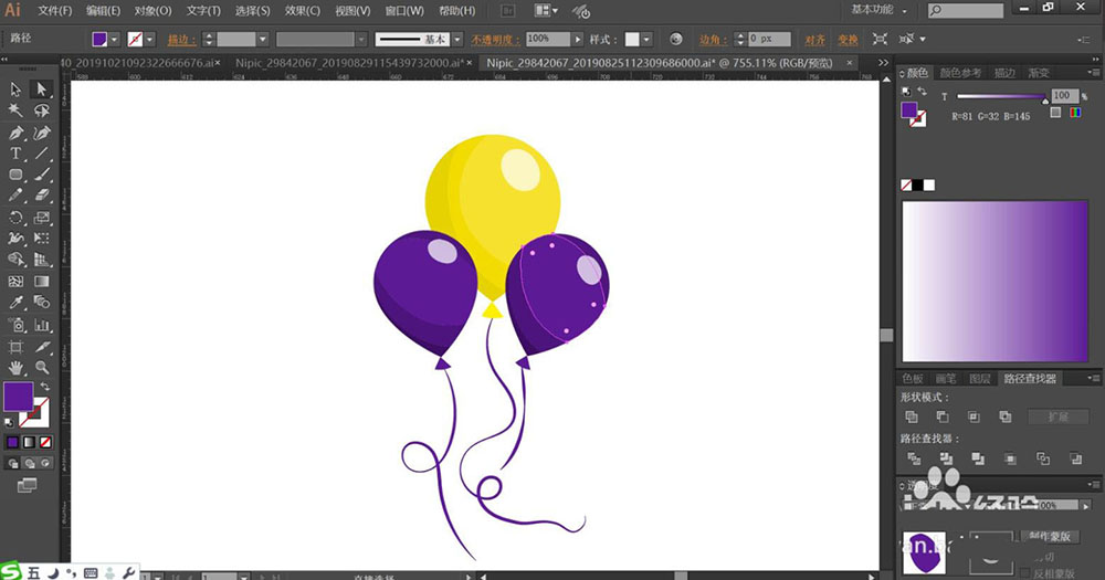 7、最后,我们再来体会一下紫色与黄色的配色效果,使用三种不同明度的黄色与紫色分别填充两只气球,让其有着光线的变化效果,再用网格工具点击气球的亮光区域让其呈现渐变效果,完成气球图片设计。