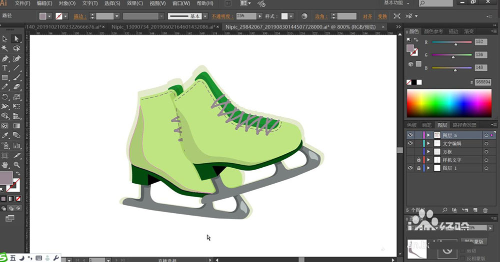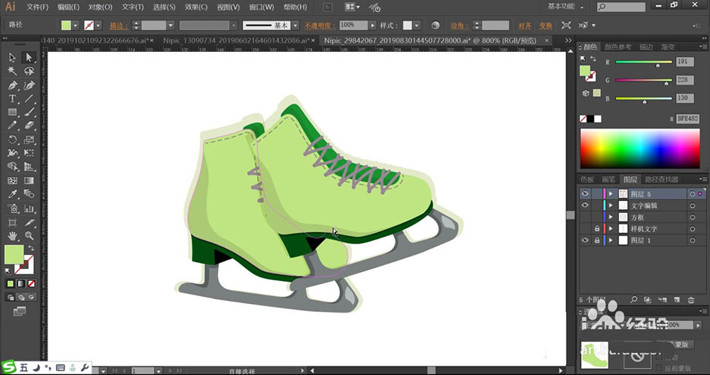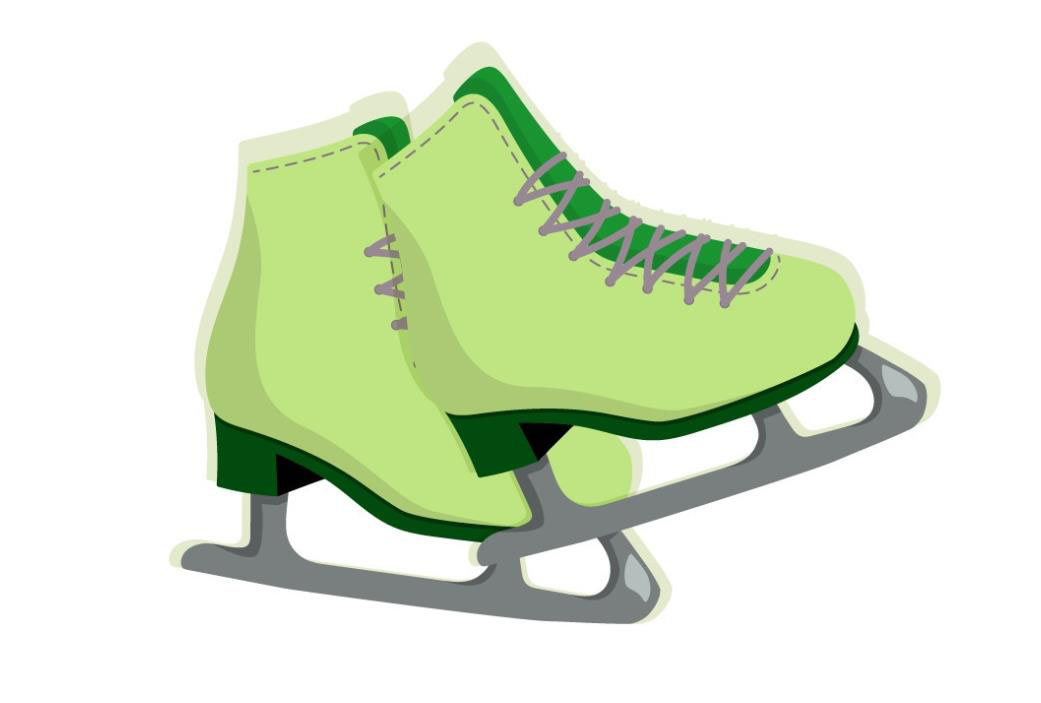2、使用浅绿色与暗绿色分别填充冰鞋的主体与鞋跟的路径,鞋面的鞋带下方也用暗绿色填充。