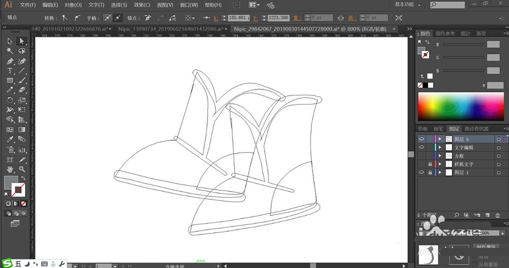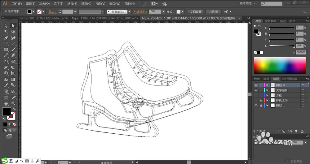 1、使用钢笔画出冰鞋的主体路径,再画出冰鞋的下方的结构件,重点绘制鞋面的鞋带的细节与鞋跟的细节路径。
