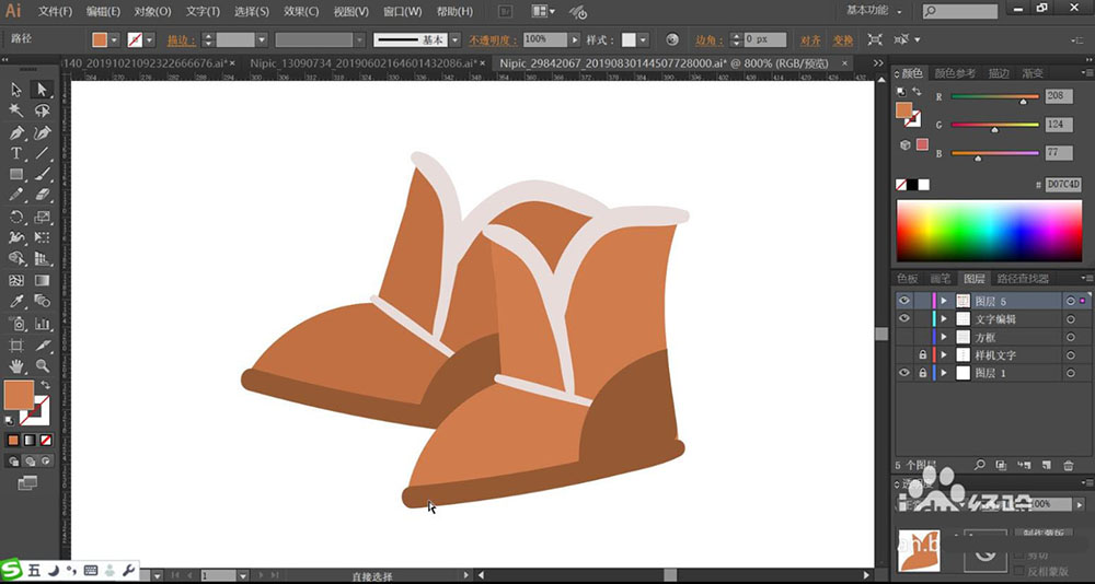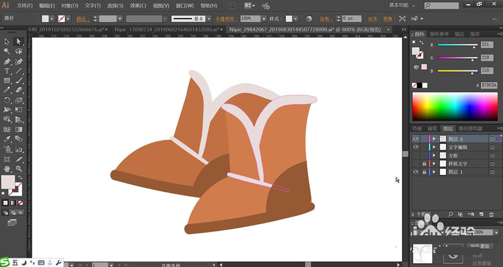 6、使用灰白色填充靴子的顶端边缘的路径,再用灰棕色填充靴子的主体路径。