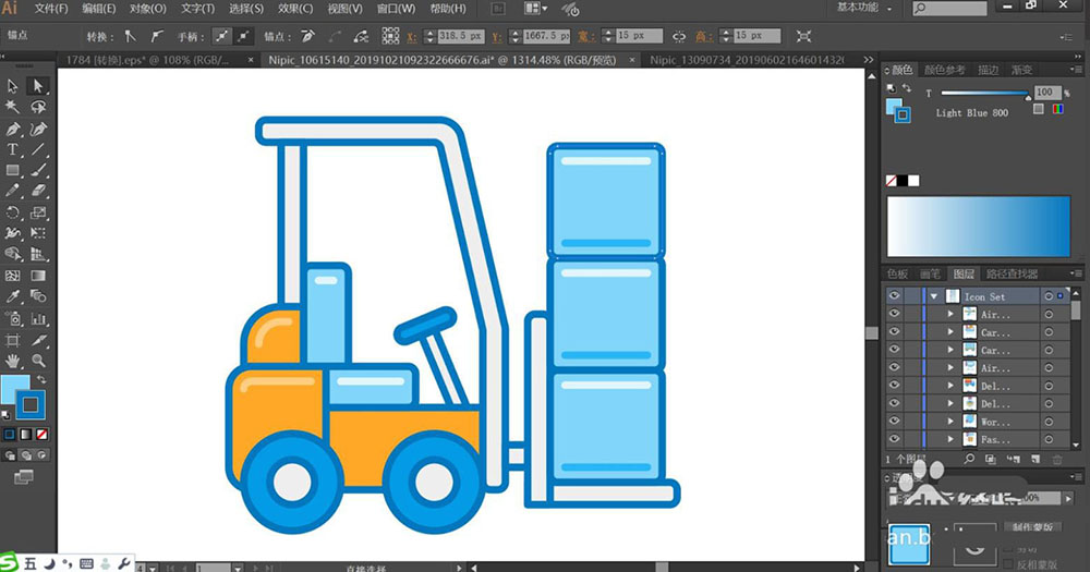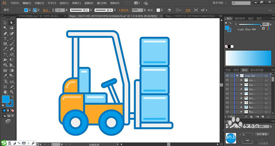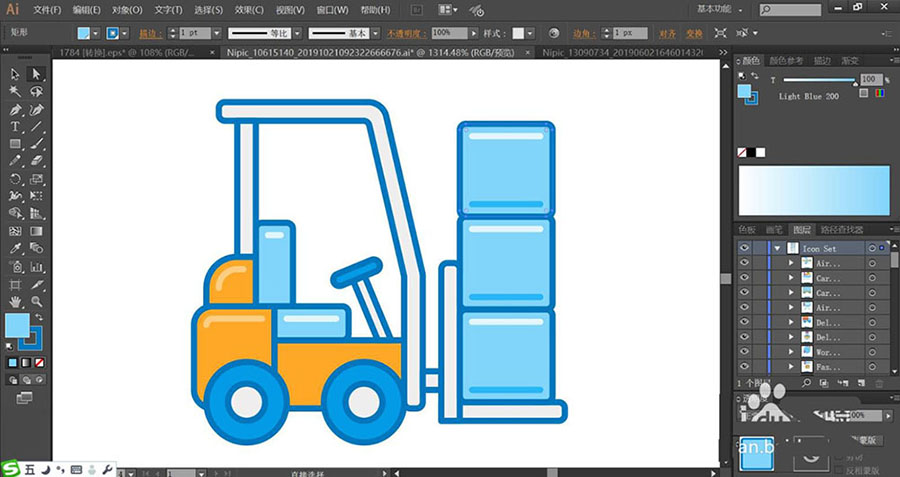 在大型的仓库里面可以看到叉车来来回回的场景,该怎么绘制这个扁平化的叉车搬运图标呢?今天,我们就来画一画叉车搬运的图标,从中学习一下货物与叉车的画法,体会一下蓝色与橙色的搭配效果,掌握应用浅色与深色来呈现亮光与暗光的画法,下面我们就来看看详细的教程。