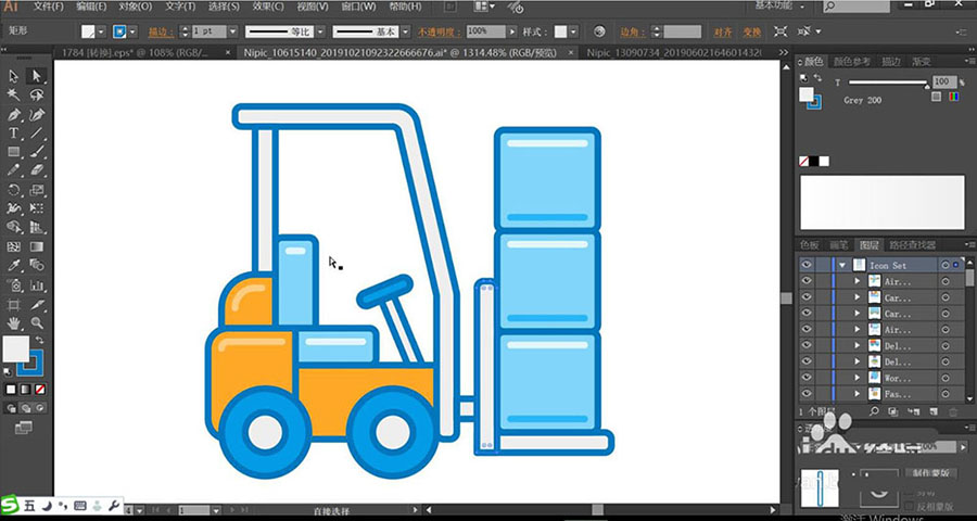 3、使用灰白色填充叉车的桁架路径,再用蓝黑色对于桁架的边缘进行描边。