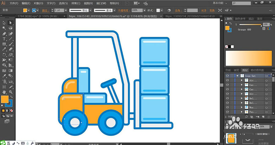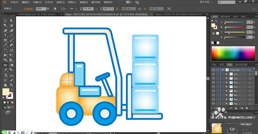 7、最后,我们用网格工具点击一下叉车的车架让其呈现橙黄色的渐变,再点击一下货物让其呈现冰蓝色的渐变效果,完成叉车搬运图标设计。