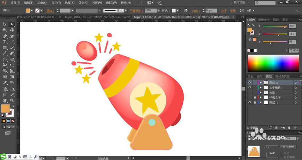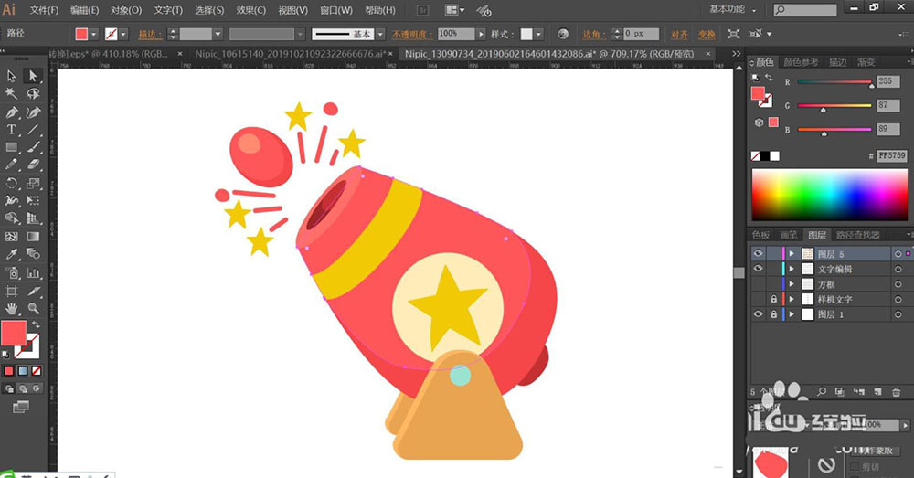 4、使用明暗不同的朱红色填充礼花车出来的椭圆弹路径,再用朱红色与金色搭配填充椭圆弹周围的线条与星星的路径。