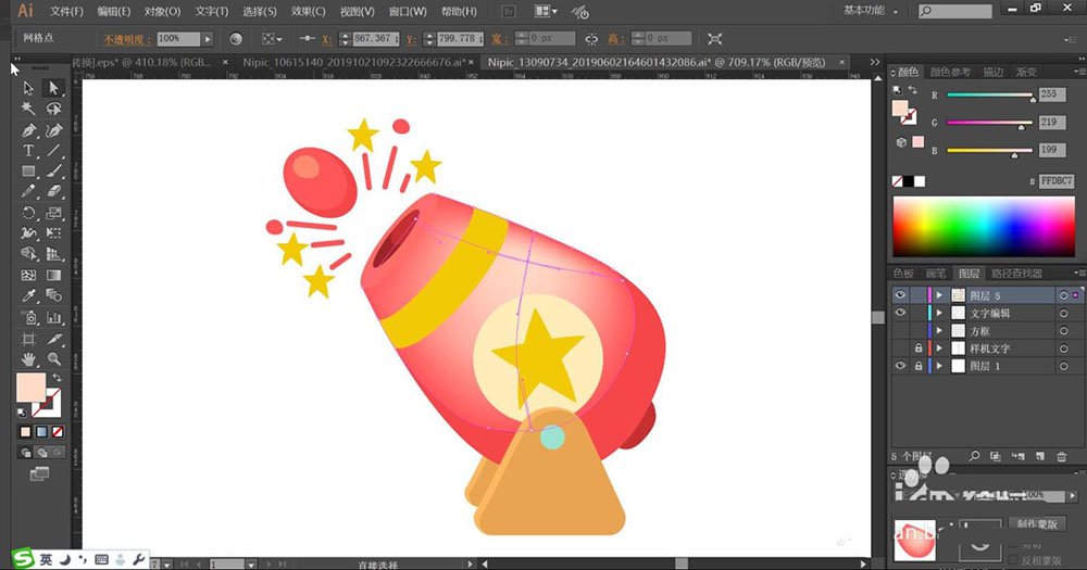 5、使用网格工具点击一下礼花车的朱红色元素的路径让渐变色呈现在管壁与椭圆弹上面。