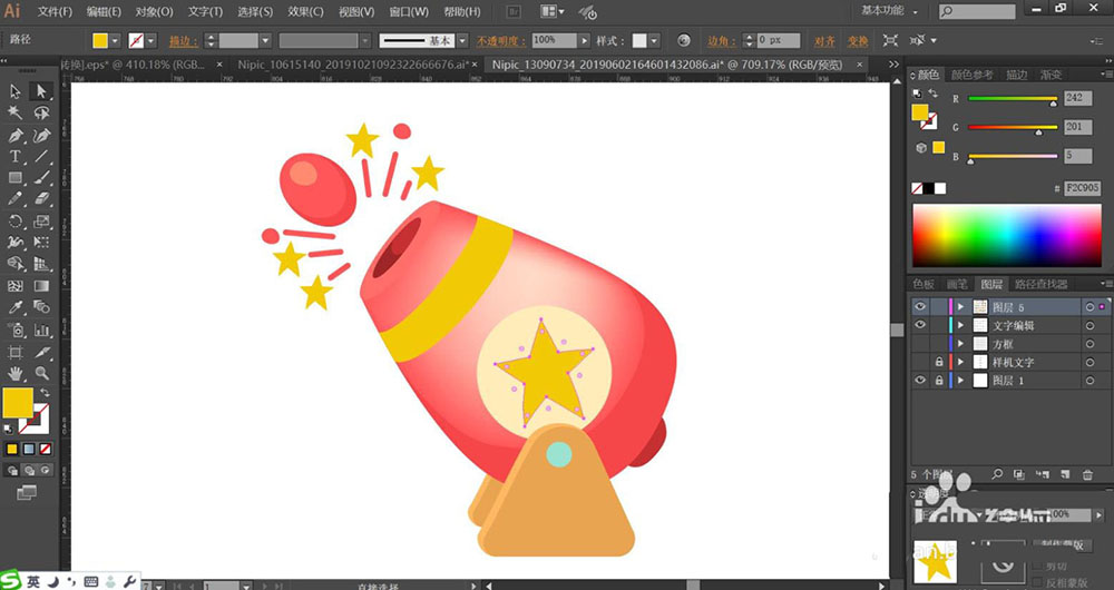 3、礼花车的中间图案用米黄色与金色搭配填充圆形与星星的路径,在管壁的顶端用金色填充圆环。