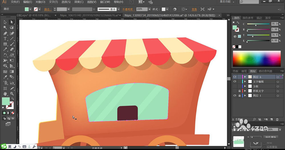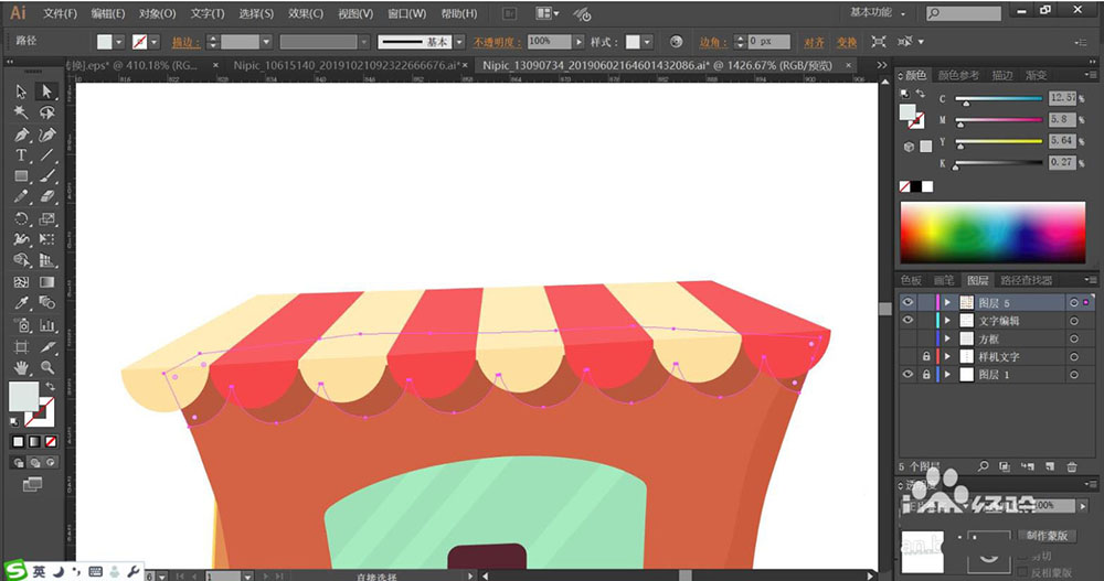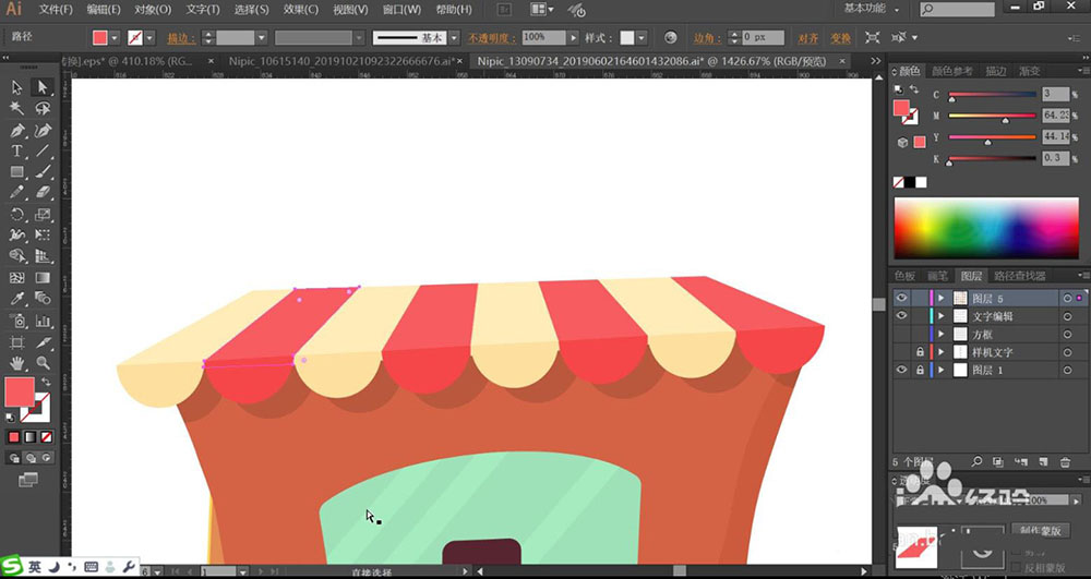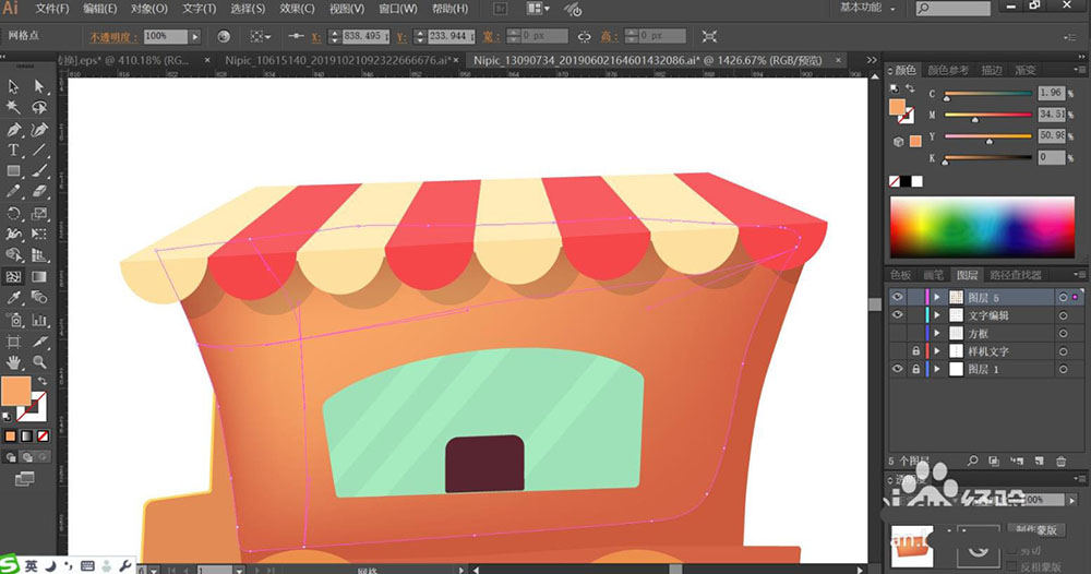 2、使用米黄色与梅红色搭配填充车顶的雨篷的路径,雨篷的前端用半圆形的形状绘制出来。