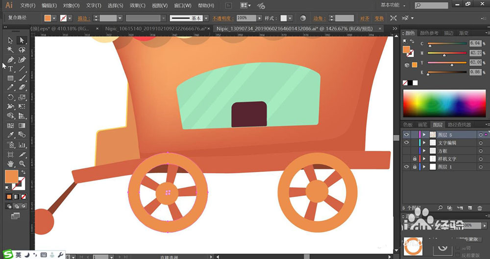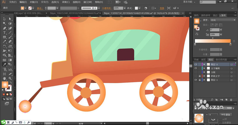 7、最后,我们用土黄色填充车体的左侧结构件,再用土红色的渐变与红棕色搭配填充车体左侧的圆球结构件,完成浪漫餐车图片设计。