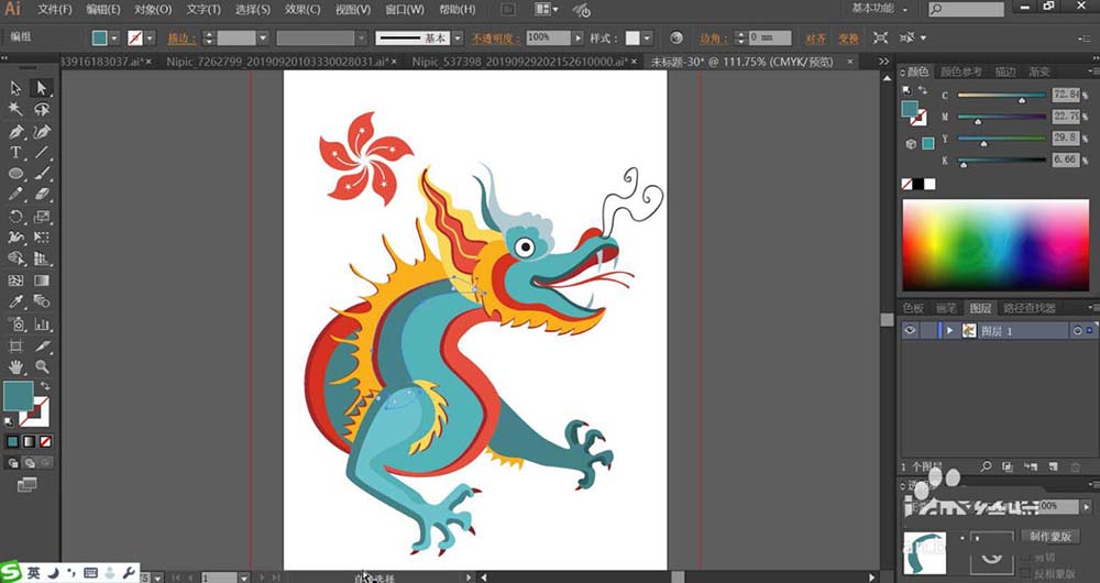 2、使用青色与暗青色搭配填充龙的身体的中间部分路径,身体背部为暗光,右侧为亮光,头部也用明暗青色搭配填充。